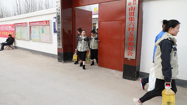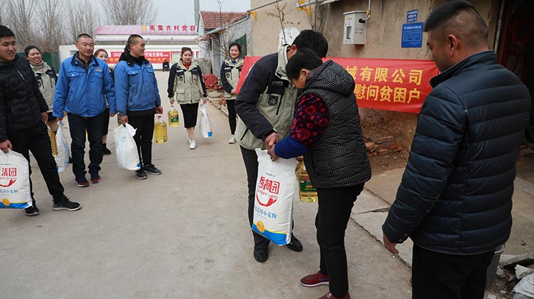公司準備了大米、食用油等生活物品,在劉總帶領下我們來到了南集六村黨群服務處,和村領導溝通了解了村內(nèi)貧困戶情況,并一起走訪慰問貧困戶。