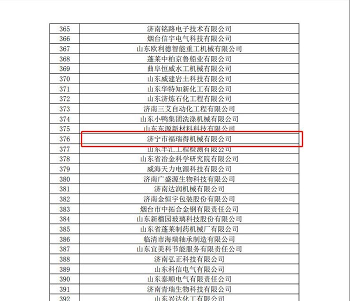 《關(guān)于公示山東省2019年擬認(rèn)定高新技術(shù)企業(yè)名單的通知》于2019年11月28日發(fā)布,濟(jì)寧市福瑞得機(jī)械有限公司名在其列。