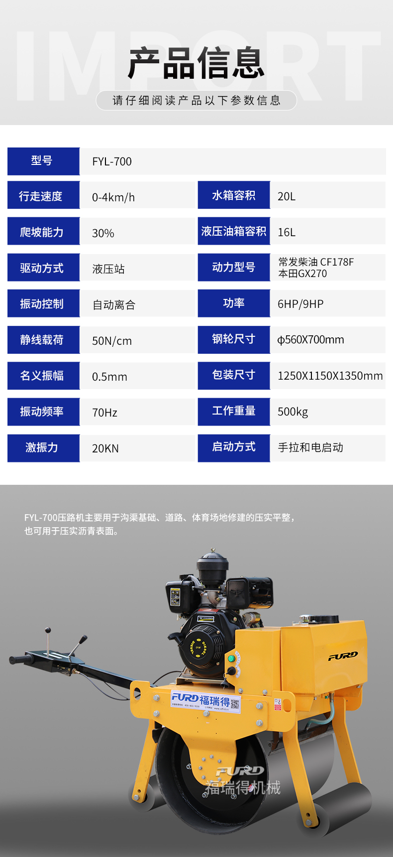 主要用于溝渠基礎,道路,體育場地的壓實整平, 也可用于壓實瀝青表面的作業(yè)。