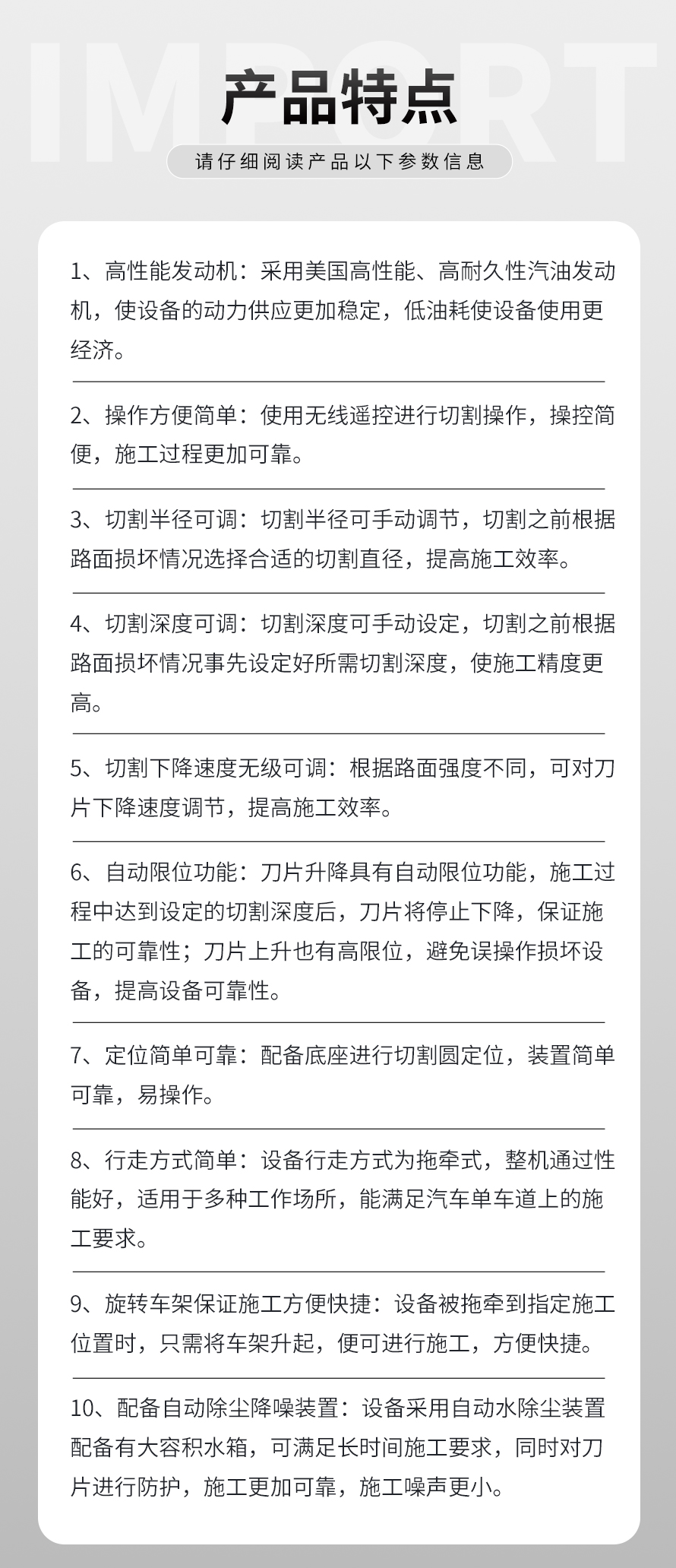 專門用于對城市道路中機(jī)動車道等井蓋周圍的水泥混凝土或瀝青路面進(jìn)行圓形切割。為清楚井蓋周圍的破損路面提供分割區(qū)域,修復(fù)后的地面美觀,延長了路面的使用壽命。
